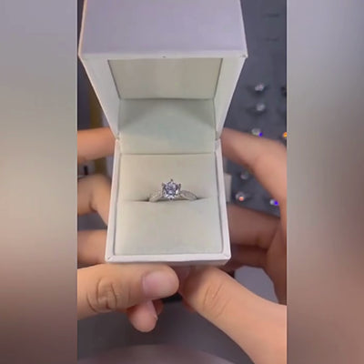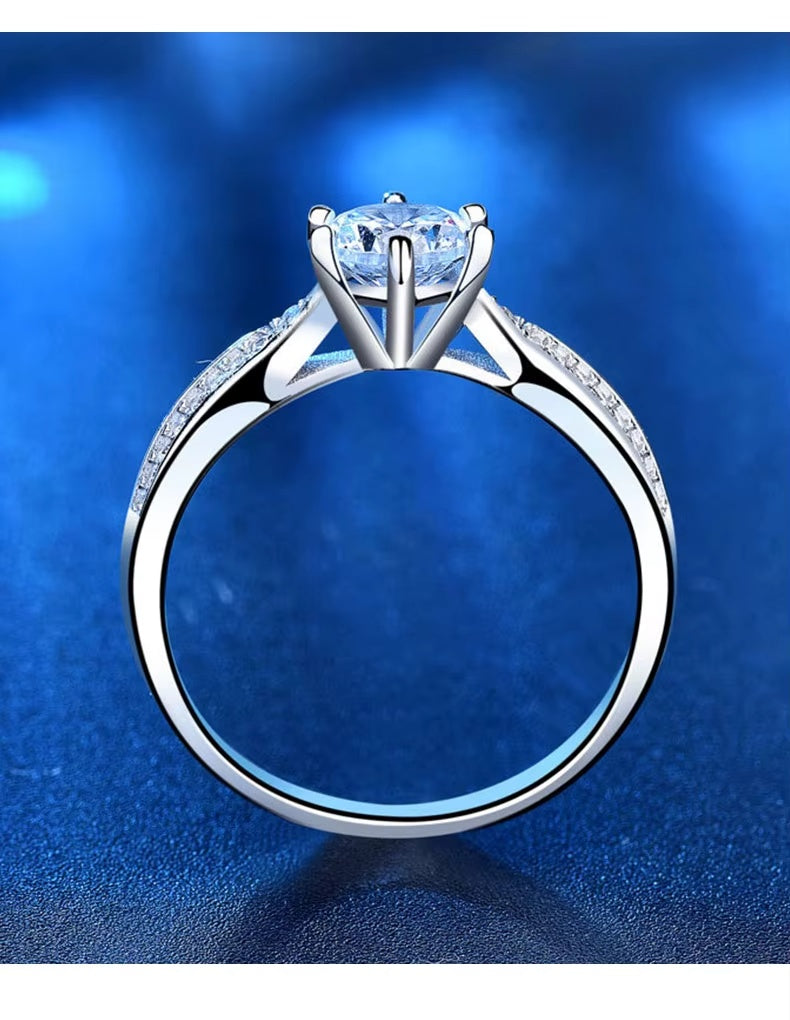 Timeless and luminous, this design centers a 1ct round brilliant moissanite in a classic six-prong crown. Pavé accents sweep along the shoulders to amplify sparkle, while solid 925 sterling silver with triple rhodium plating delivers enduring shine and everyday durability. A refined piece for proposals, anniversaries, and meaningful gifts.